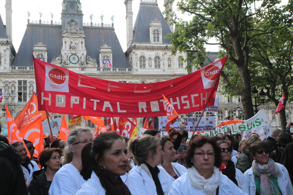 Paris, le 21 mai 2015. Rassemblement devant le siège de la direction de l'AP-HP, rue Victoria, à l'appel de tous les syndicats. Plusieurs milliers de salariéEs exigent le retrait du projet de Martin Hirsch.