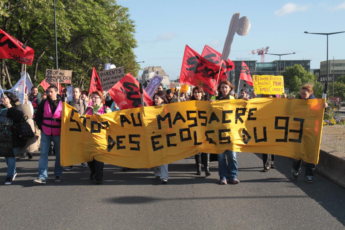 Saint-Denis, le 19 mai 2015. Manifestation des parents et des enseignants à l'entrée de l'autoroute A1 contre la casse de l'école