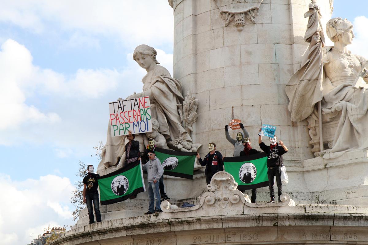 Militants et drapeaux anonymous et pancarte TAFTA ne passera pas par moi sur la statue de la République à Paris.