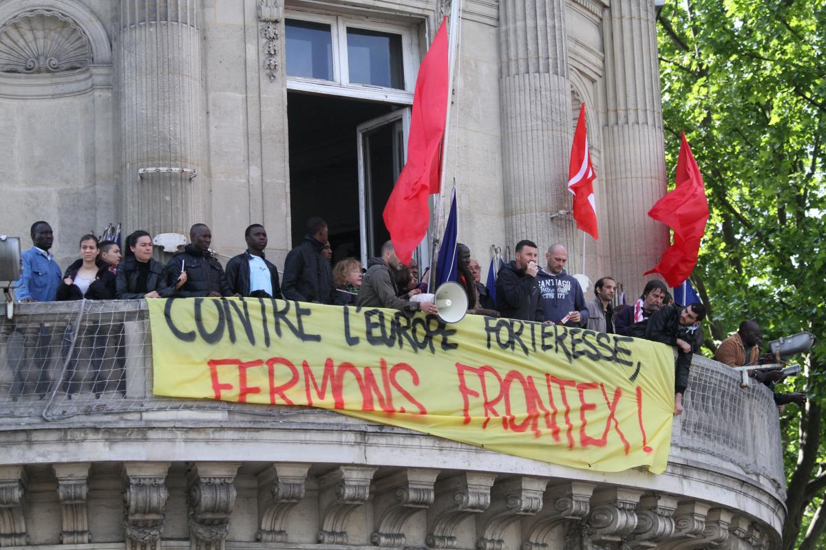 Mardi 6 mai 2014, le NPA et le collectif des sans-papiers du 75 investissent le siège de la Commission Européenne à Paris, devant l'Assemblée Nationale, pour présenter Monsieur Sissoko comme président de la Commission. Ils fêtent ainsi l'anniversaire des 2 ans de la présidence Hollande. Ils dénoncent l'Europe forteresse, exigent la fermeture de Frontex, sur une banderole posée sur le balcon du bâtiment.