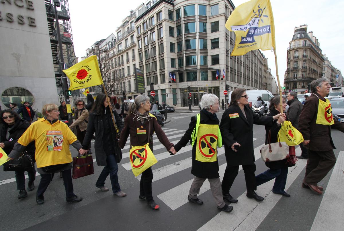 Mardi 5 mars 2013, Paris, conférence de presse de Sortir du Nucléaire et mini chaine humaine devant la Bourse pour annoncer la mobilisation du samedi 9 mars 2013