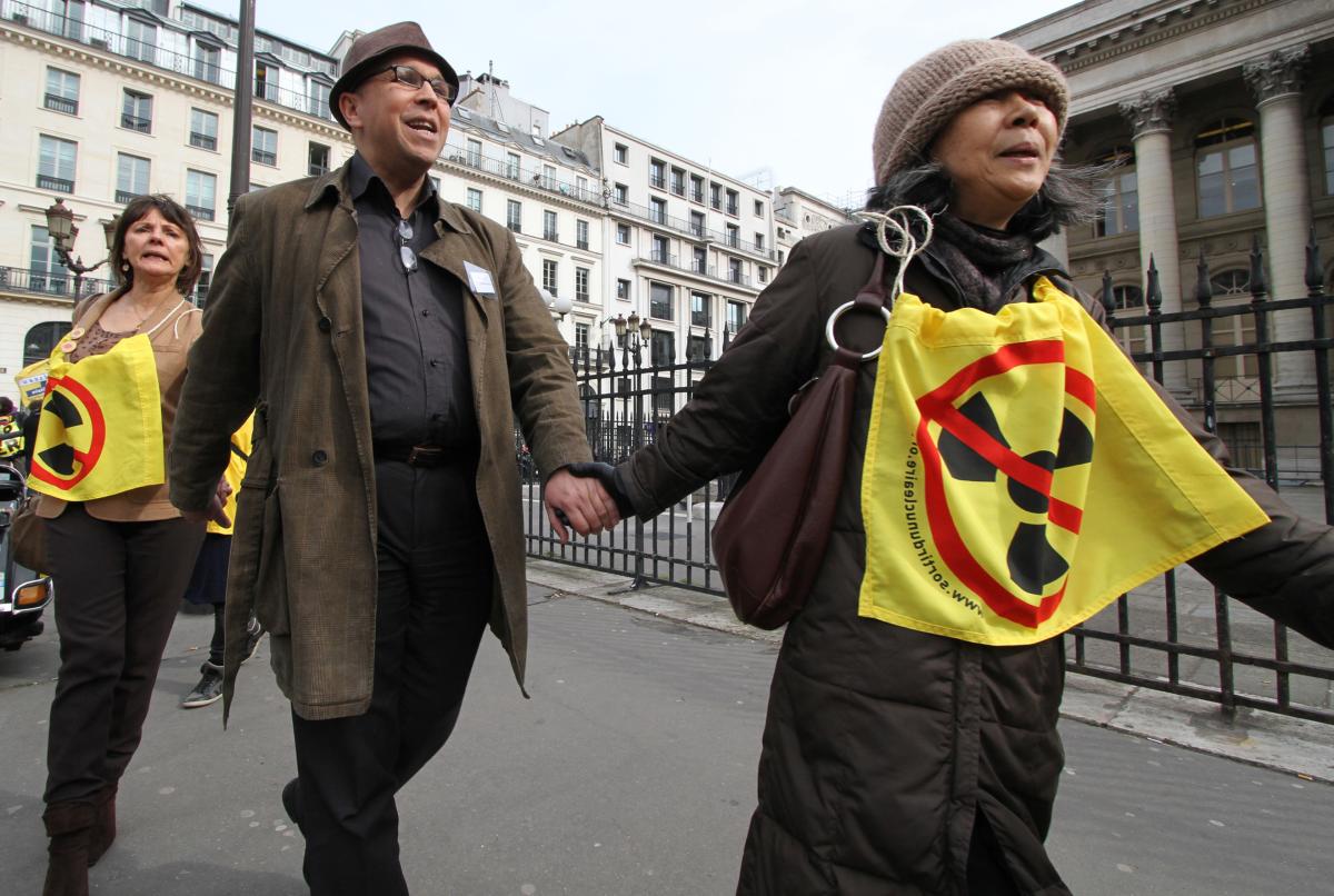 Mardi 5 mars 2013, Paris, conférence de presse de Sortir du Nucléaire et mini chaine humaine devant la Bourse pour annoncer la mobilisation du samedi 9 mars 2013