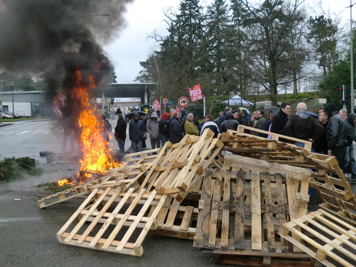 Au Mans le 5 fevrier 2013, débrayage et rassemblement de 500 personnes. Un grand feu de pneus et palettes devant lentrée de lusine. Ensuite un défilé sur la rocade et une prise de parole devant le domicile de Stéphane le Foll, ministre de lagriculture et élu de la ville.
