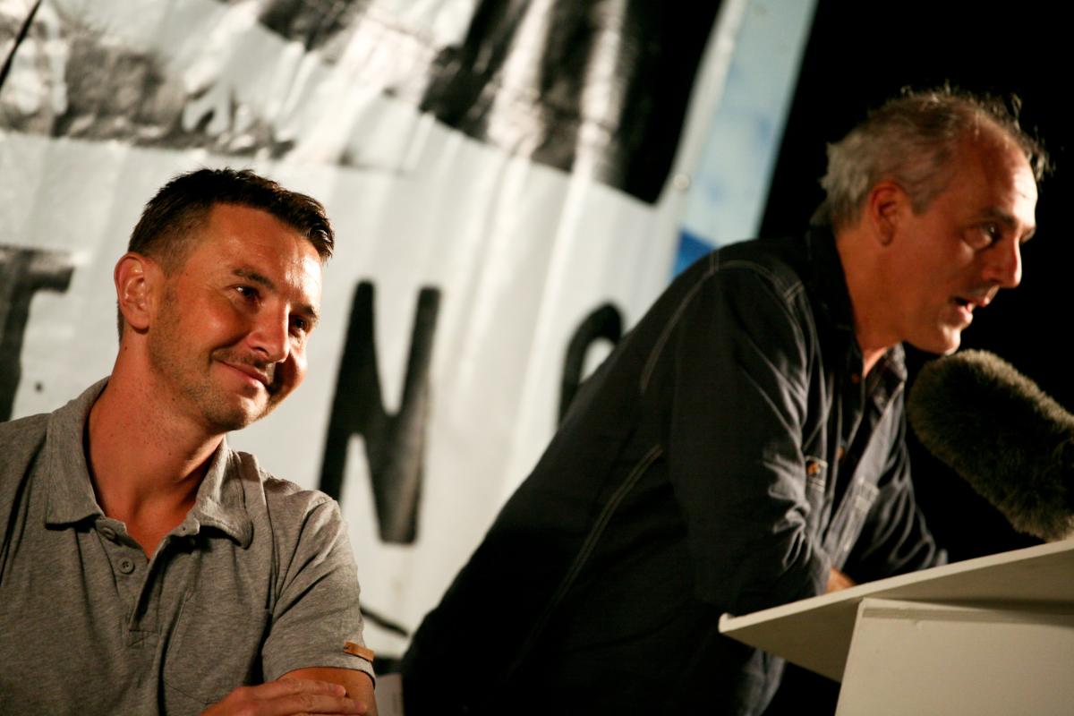 Port-Leucate, le 26 Aout 2012. Olivier Besancenot et Philippe Poutou lors du meeting d'ouverture de l'université d'été du Nouveau Parti Anticapitaliste.