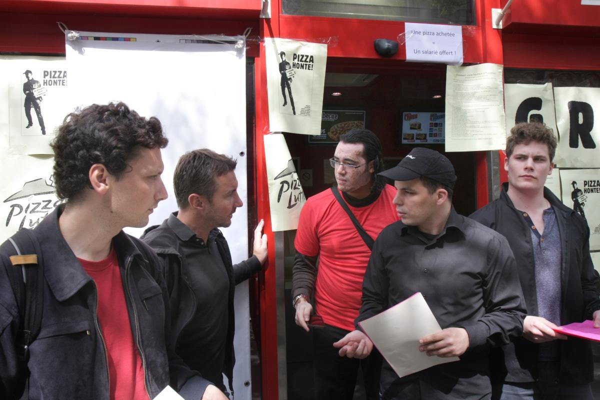 Olivier Besancenot avec les syndicalistes de SUD Pizza Hut devant le restaurant