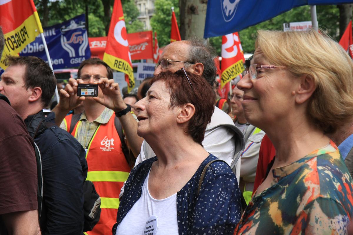 Rassemblement le 28 juin 2012 des salariés de PSA devant le siège, avenue de la Grande Armée à Paris, contre la menace des licenciements et la fermeture du site d'Aulnay. Des délégations de Renault, d'Opel, de Général Motor, d'Espagne, d'Allemagne sont venues. Philippe Poutou, Xavier Mathieu et Arlette Laguiller sont présents.