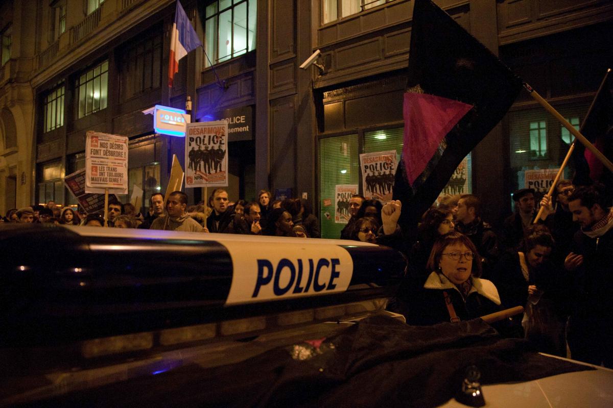 Paris, le 13 Janvier 2012. Rassemblement devant le commissariat du 3ème arrondissement pour siffler l'Internationale: une semaine plus tôt, Denis Godard, salarié d'Act Up Paris et militant du NPA, avait été frappé par un policier pour ce motif.