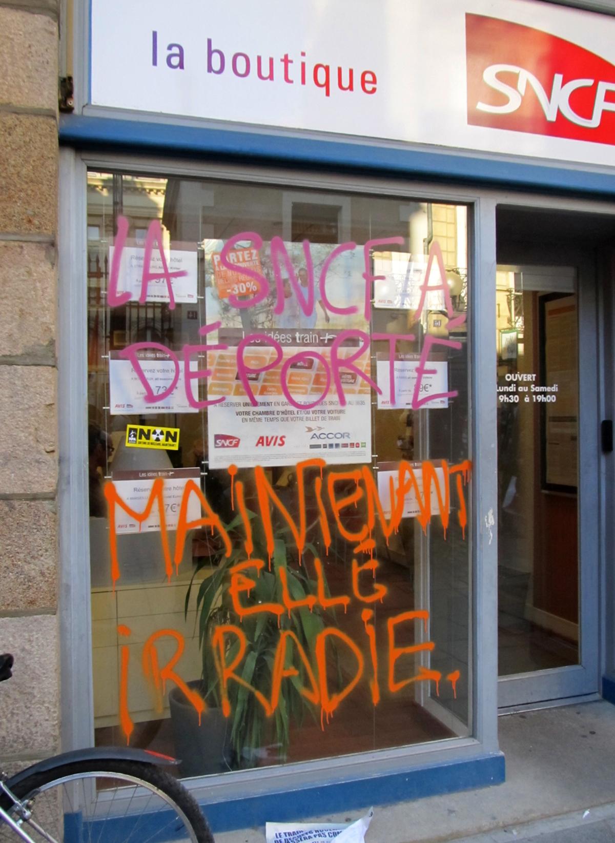 Devanture de la boutique SNCF taguée: la SNCF a déporté maintenant elle irradie