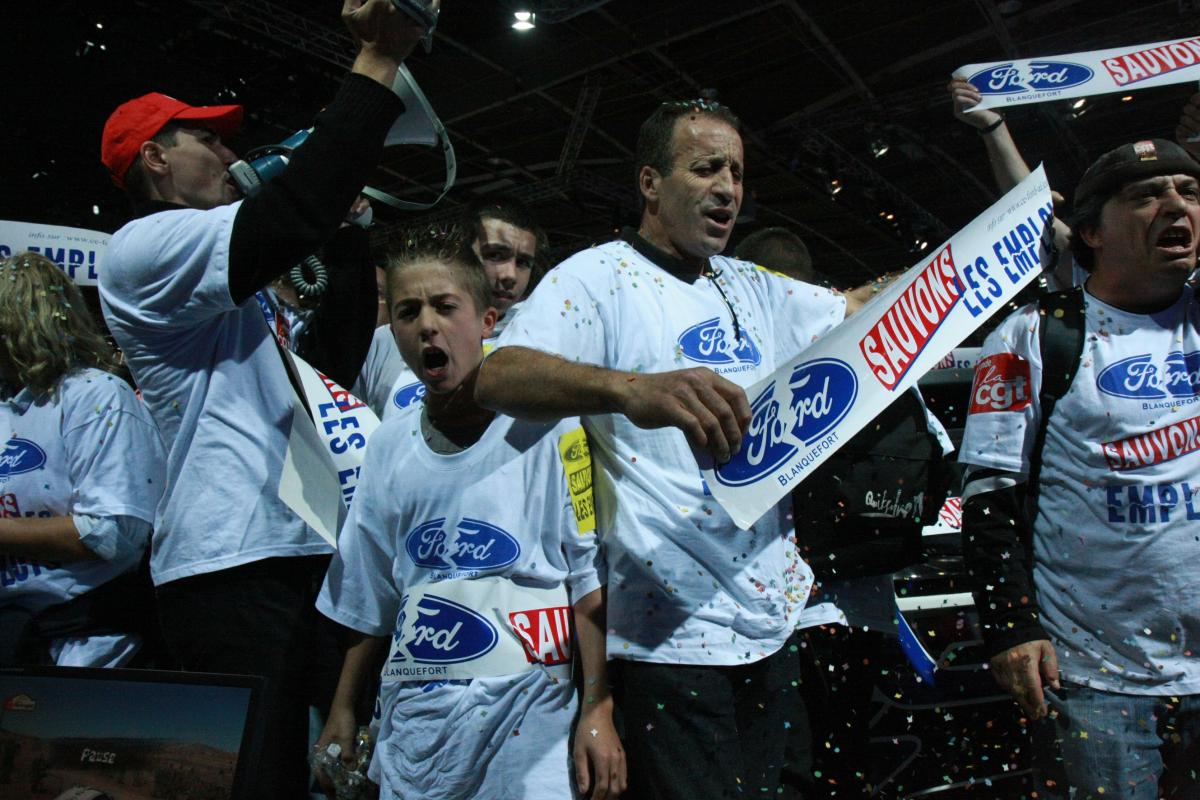 Samedi 2 octobre 2010 ouverture du Mondial de l'automobile Porte de Versailles à Paris. Les salariés de FORD à Bordeaux, après avoir tenu un meeting devant l'entrée, pénètrent dans le salon en manifestant et investissent le stand FORD