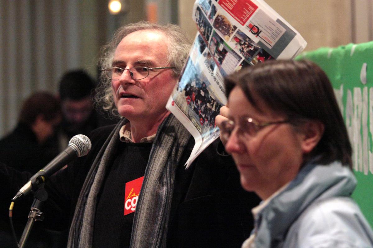 Raymond Chauveau présentant le journal n°1 de la grève des sans-papiers et Francine Blanche