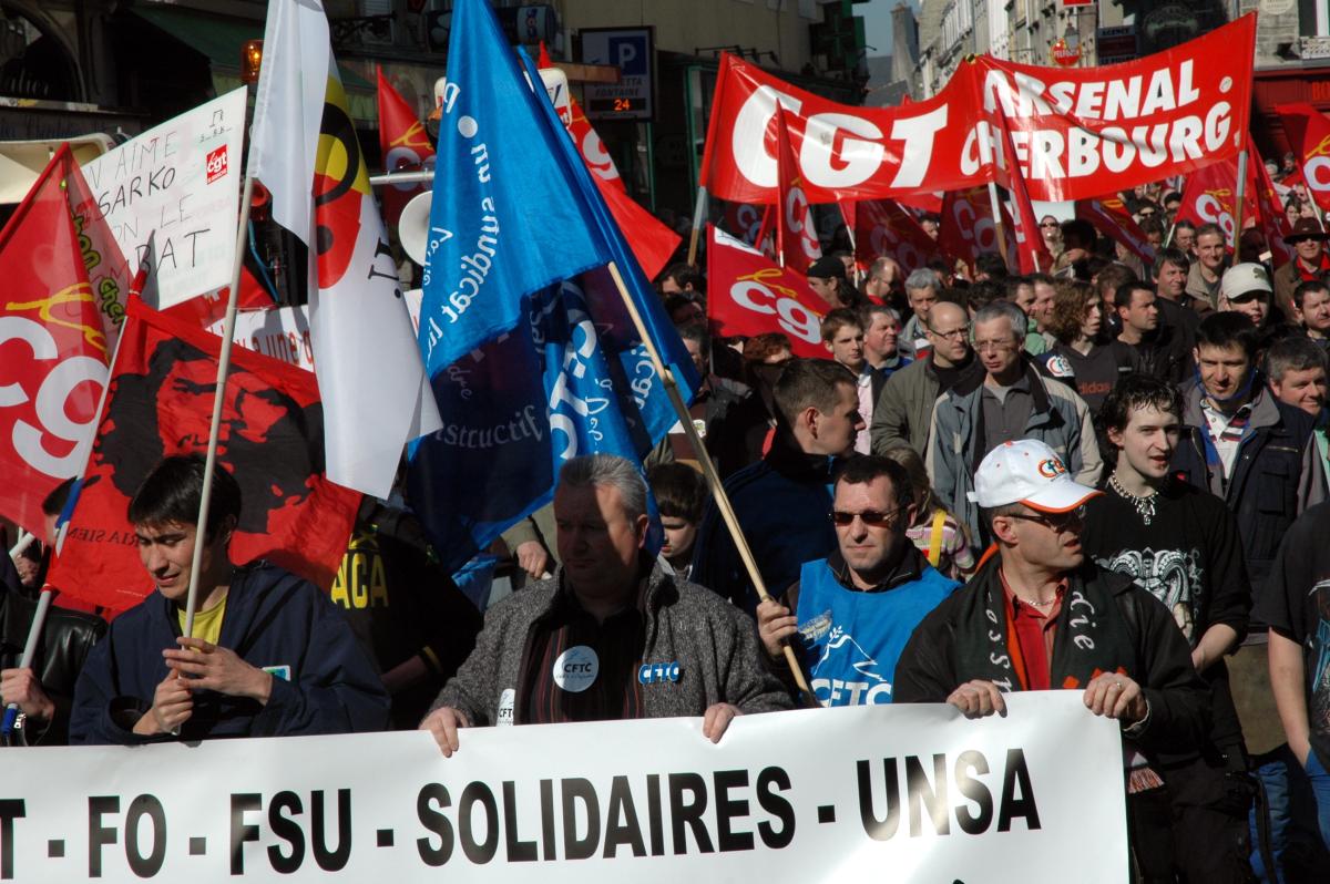 Cherbourg le 19 mars 2009. 18 000 manifestants se sont mobilsé à l'appel de l'intersyndicale. Banderole unitaire et banderolle CGT arsenal de Cherbourg.