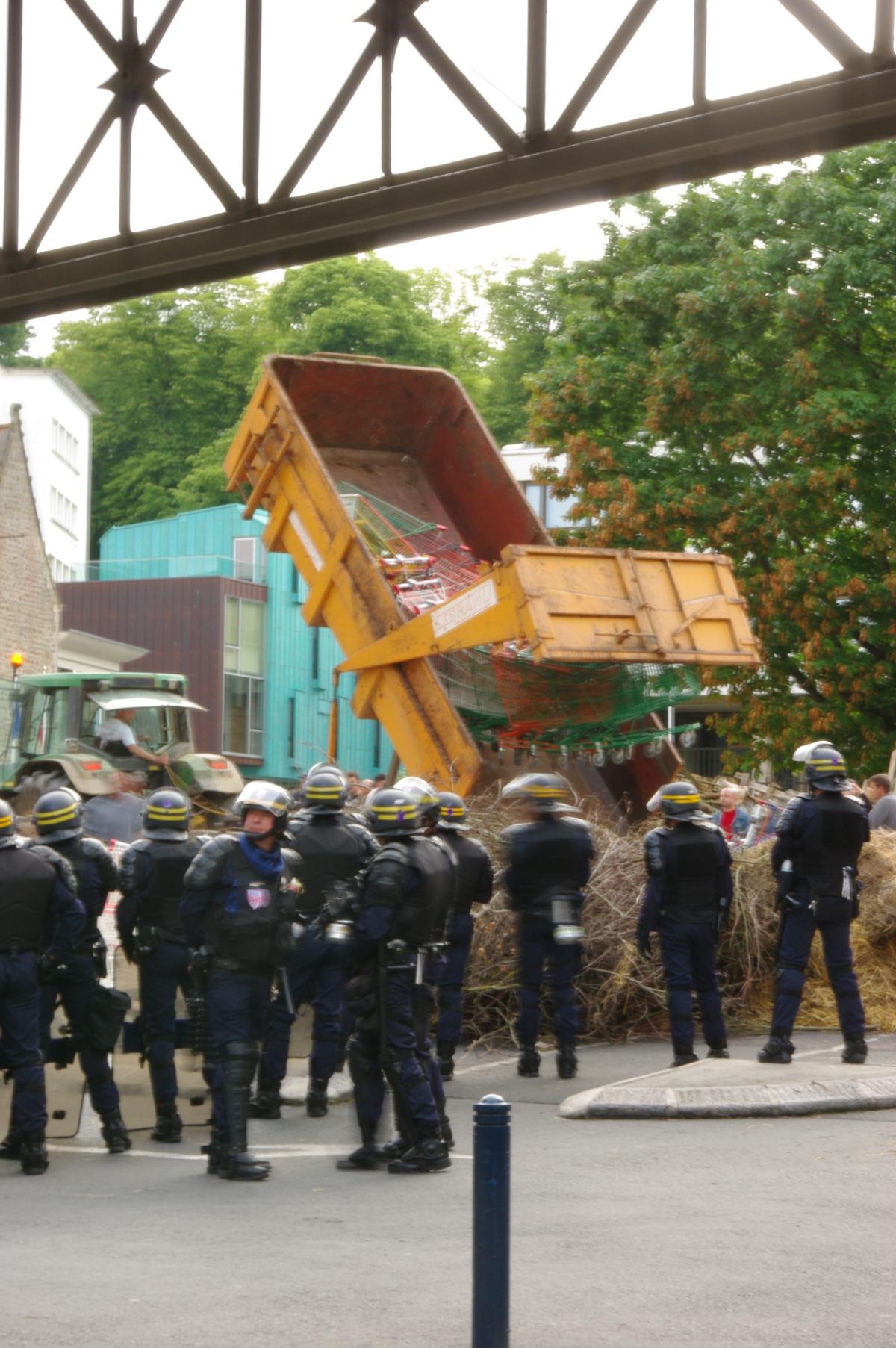 manifestation d'environ 1 000 agriculteurs à Saint Brieuc contre les marges de la grande distribution , en fin de soirée les CRS chargent et usent des lacrymos