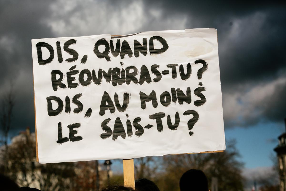Une pancarte paraphrasant une chanson de Barbara demandant la reouverture de salles, rassemblement pour la reouverture des lieux de spectacle , Place de la Bastille, Paris, 15 decembre 2020. Photographie de Martin Noda / Hans Lucas