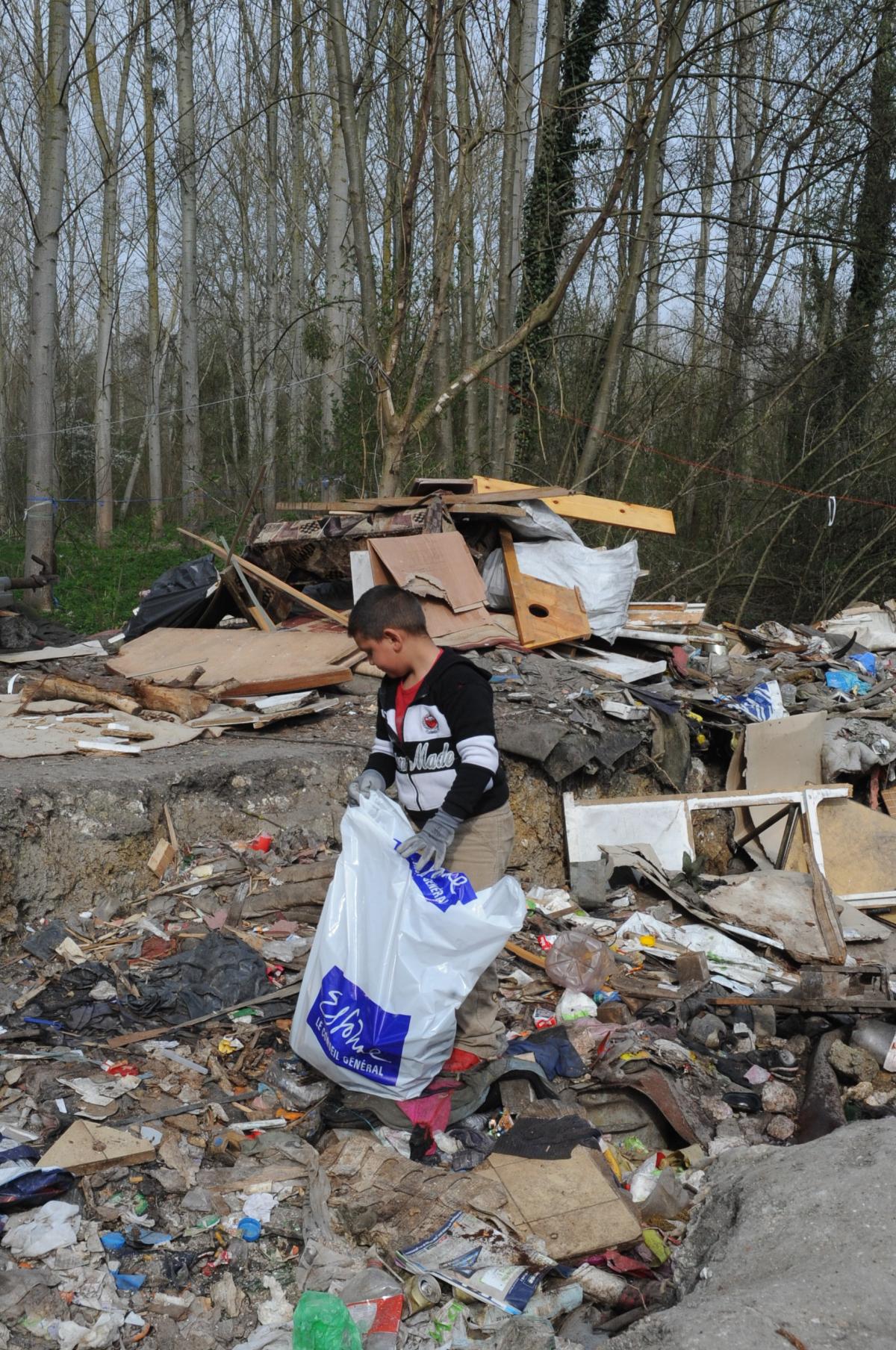jeune Roms rempli son sac poubelle à la journée Essonne propre