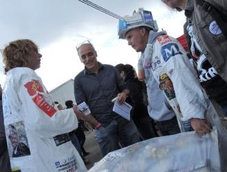 Philippe Poutou au Stand du Npa les Sanofi entreprise de l'industrie pharmaceutique en lutte