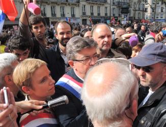 Clémentine Autin Jean Luc Mélanchon en visite au point fixe du Npa et Philippe Poutou