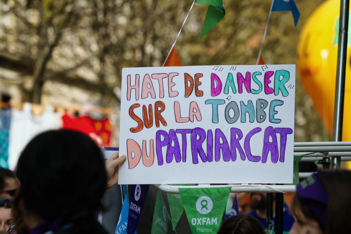 France, Paris, 2026-03-08. Une pancarte sur laquelle on peut lire "Hate de danser sur la tombe du patriarcat". Manifestation pour les droits des femmes. Photographie de Martin Noda / Hans Lucas