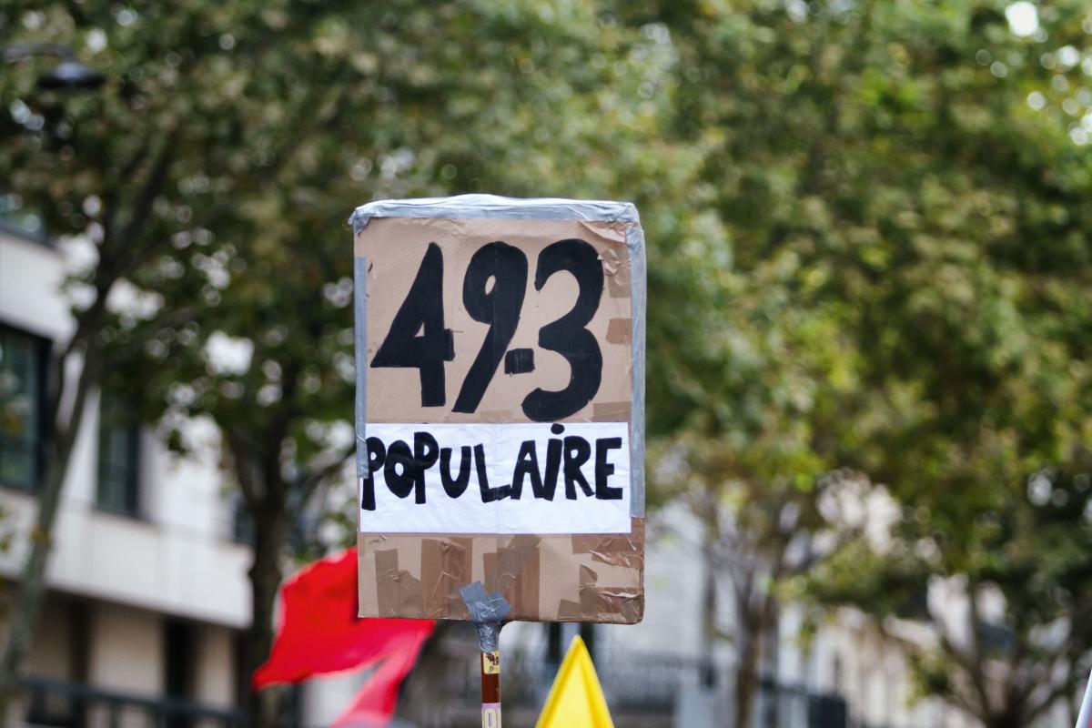 France, Paris, 2025-10-02. A placard reading "Popular 49.3". Inter-Union demonstration against austerity budget. Photograph by Martin Noda / Hans Lucas