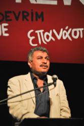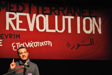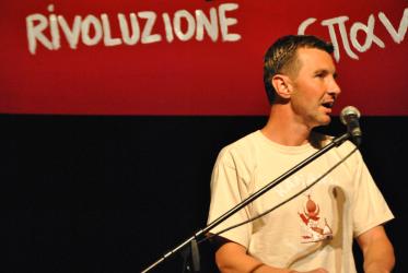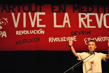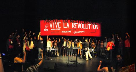 Les membres des délégations internationales sur la scène chantant l'Internationale