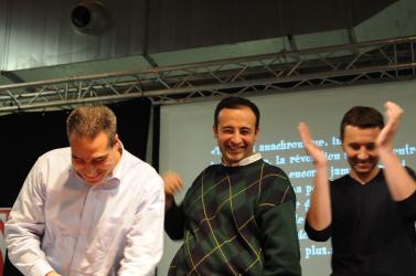 convivialité et sourires à la fin du meeting de solidarité Tunisie Egypte au 1er congrès du NPA