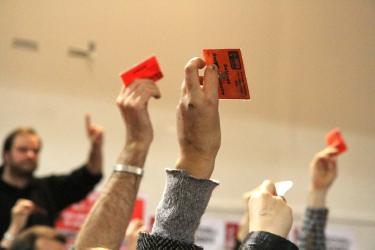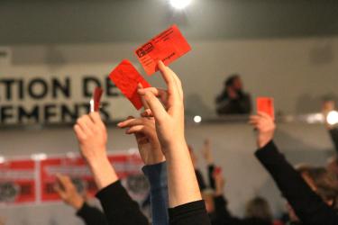 Des délégués affichent la faucille et le marteau