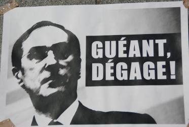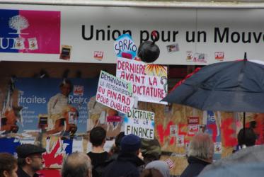 manifestantsdevant le local de l'UMP arrachant leurs affiches