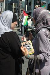 Femmes avec tract Nos voix pour la Palestine.