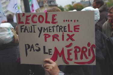 pancarte d'une manifestante demandant plus de moyens pour l'école