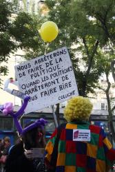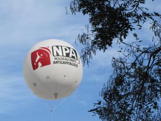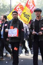 Ouvriers sur le parcours de la manif avec le faux billet du NPA