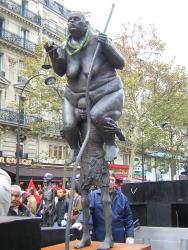 Sculpture d'un homme portant sur ses épaules une grosse femme tenant la balance de la justice.