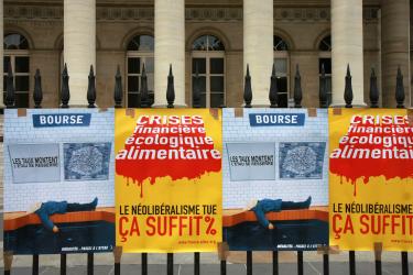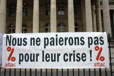 Banderole ATTAC nous ne paierons pas leur crise sur les grilles de la Bourse