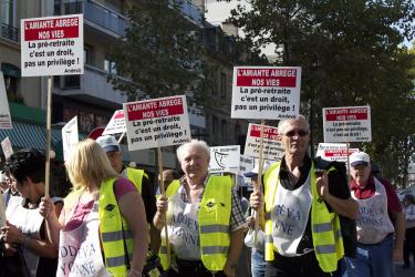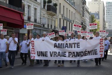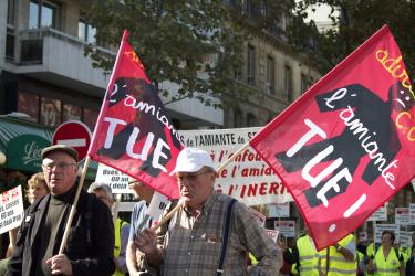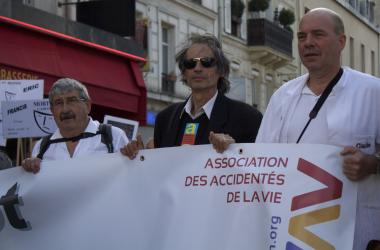 Manifestants tenant la banderole de la FNATH association des accidentés de la vie