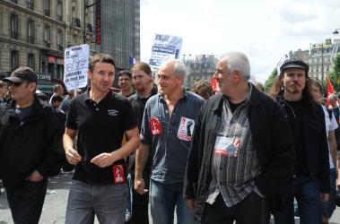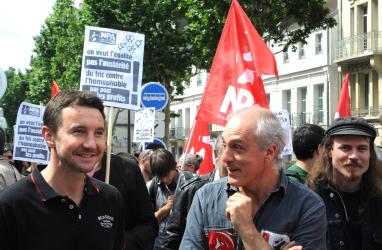 Olivier Besancenot et Philippe Poutou sous la Banderole Npa Reprenons la rue pour exiger l'égalité réelle