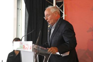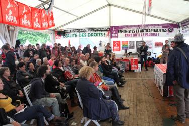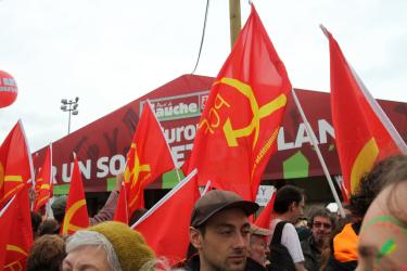 Militants du PCF avec drapeaux devant le stand du PG lors de la présentation du plan B
