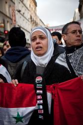 Manifestante en larmes, tenant le drapeau syrien.