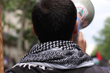 Manifestant avec un haut-parleur portant un foulard palestinien.