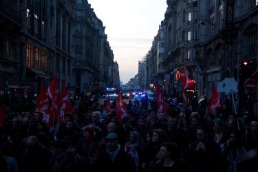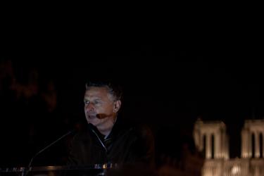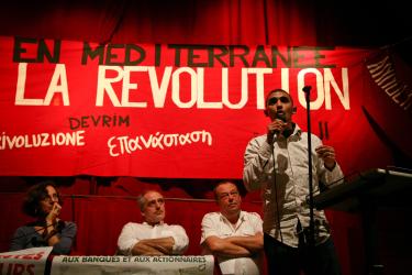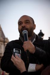 Olivier Le Cour Grandmaison intervenant à la tribune en fin de meeting.
