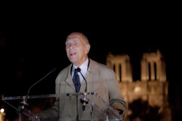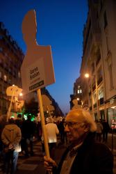 Stéphane Hessel intervenant à la tribune à la fin de la manifestation.