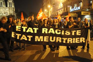 Abdelkarim Aïchi, porte-parole du PIR et du collectif Vérité et Justice pour Ali Ziri, devant une affiche