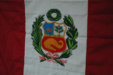 L'enseigne nationale (pabellón nacional) Elle porte, sur la bande centrale, les armoiries du Pérou (escudo de armas).