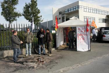 la tente installée par les grévistes devant l'entrée