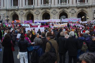 dislocation de la manifestation sur les marches de l'opéra banderoles des organsations