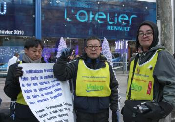 Délégation d'ouvriers coréens de Valeo devant le siège de Valeo à Paris avec le drapeau de leur syndicat KMWU