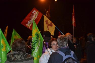 Cortège NPA + signe radioactif en arrière plan