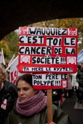 Manifestant avec un masque de Sarkozy et une pancarte