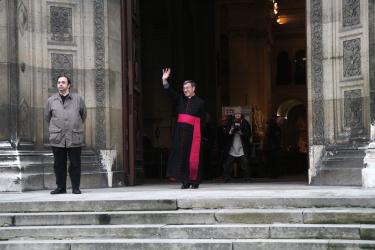 Le curé de l'église Saint François Xavier, dont les cloches sonnent à toutes volées, salue les manifestants