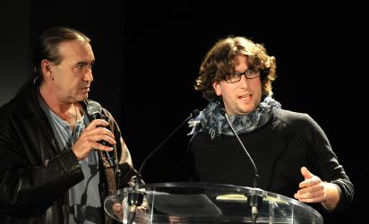 Olivier Besancenot et le secrétaire général du Livre Cgt devant le ministère de la culture et de la Communication