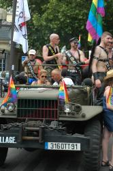 camion militaire et publicité de boite de nuit à la Marche des Fiertés.