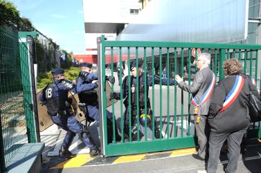 Les CRS séparent les manifestants l'ors de l'inauguration du CHSF Centre Hospitalier Sud Francilien de Corbeil par Marisol TOURAINE Ministre des Affaires sociales