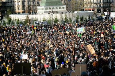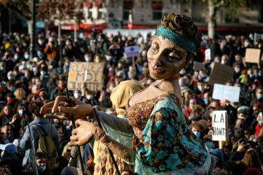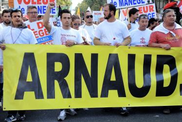 Marcel Campion (vétement sombre) avec les Forains à la manifestation de la France Insoumise